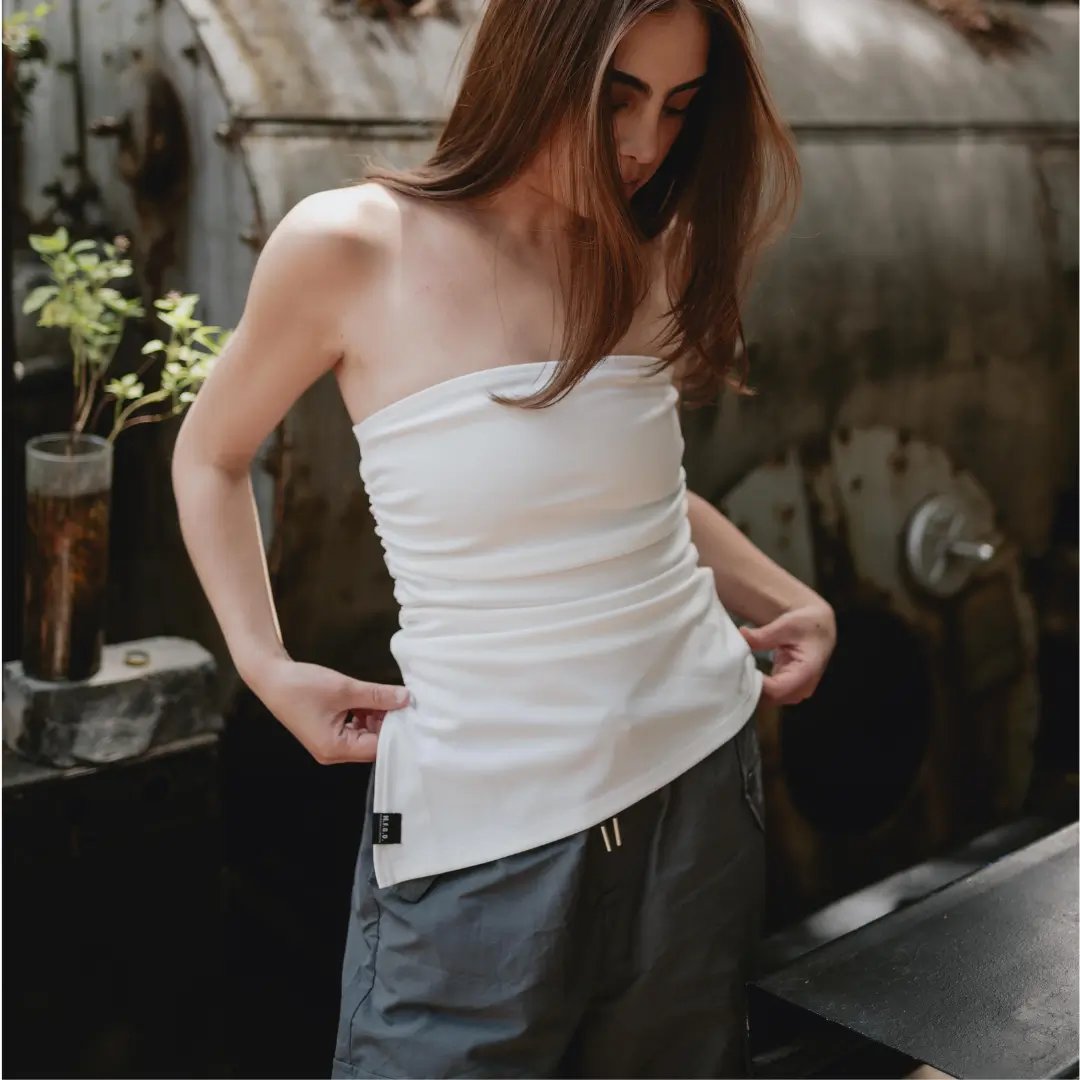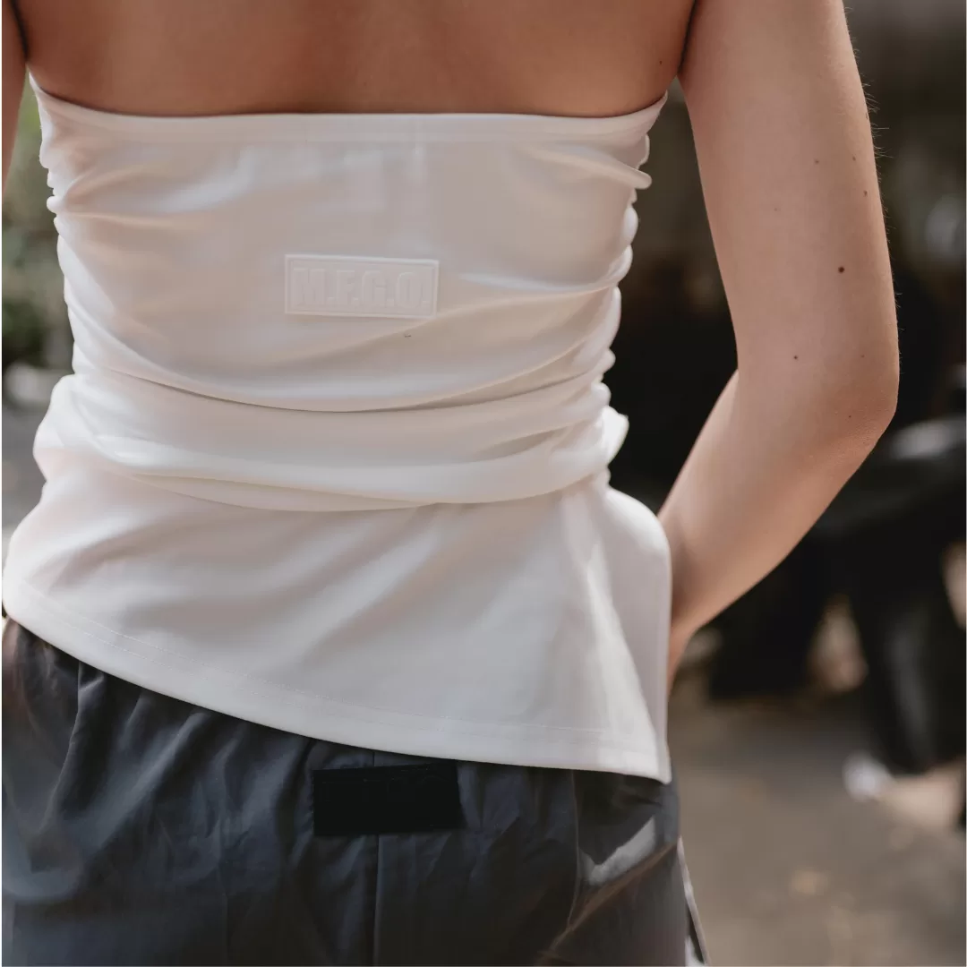 Diseñado para convertirse en tu nuevo go-to, este top blanco strapless con corte asimétrico redefine lo que significa ser básico. Su silueta minimalista y su diseño fuera de lo común hacen que combine con todo, pero nunca pase desapercibido.