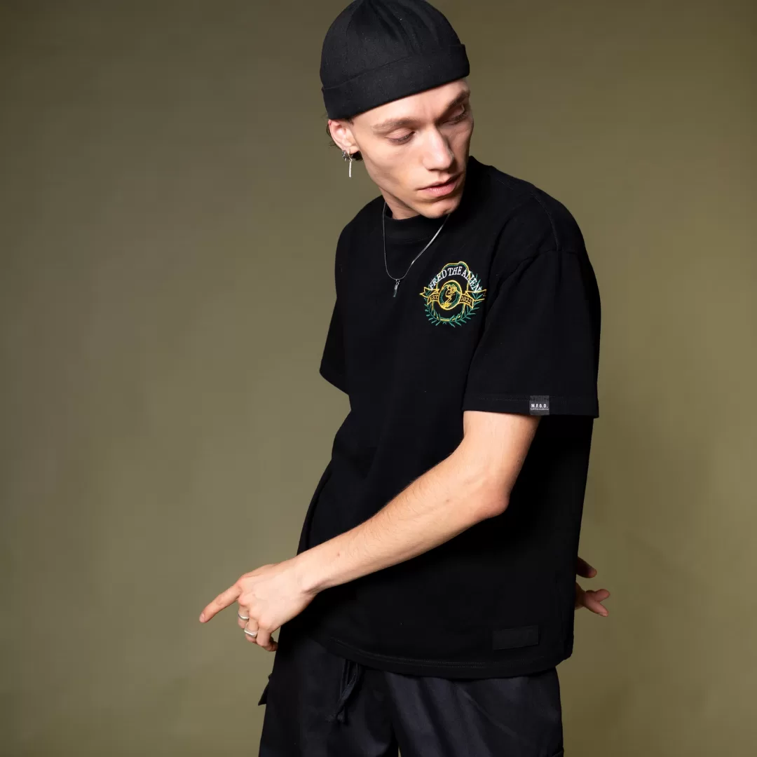 La Fred’s Tee es más que una simple playera negra; es una declaración de estilo. En la parte frontal, encontrarás un escudo bordado con la icónica figura de Fred The Alien en patineta, un símbolo de rebeldía, creatividad y movimiento constante. Este diseño no solo aporta un toque de exclusividad, sino que también refleja la esencia de la cultura streetwear: libertad, expresión y autenticidad.
